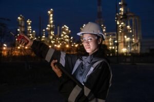 Two engineers in protective gear using a tablet and walkie-talkie while inspecting an illuminated industrial refinery site at night.