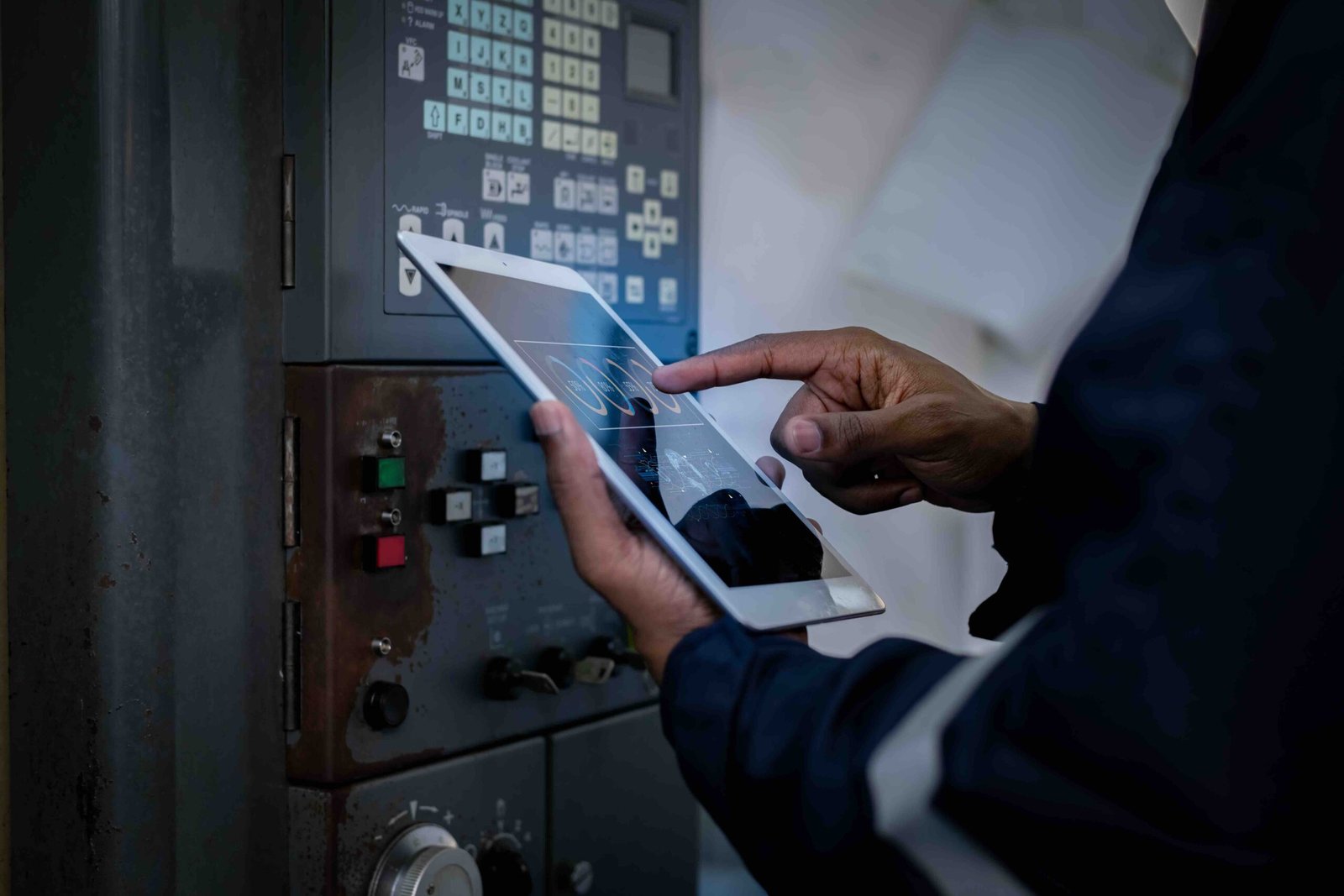 team engineers inspecting on machine with smart tablet. Worker works at heavy machine robot arm. The welding machine with a remote system in an industrial factory. Artificial intelligence concept.